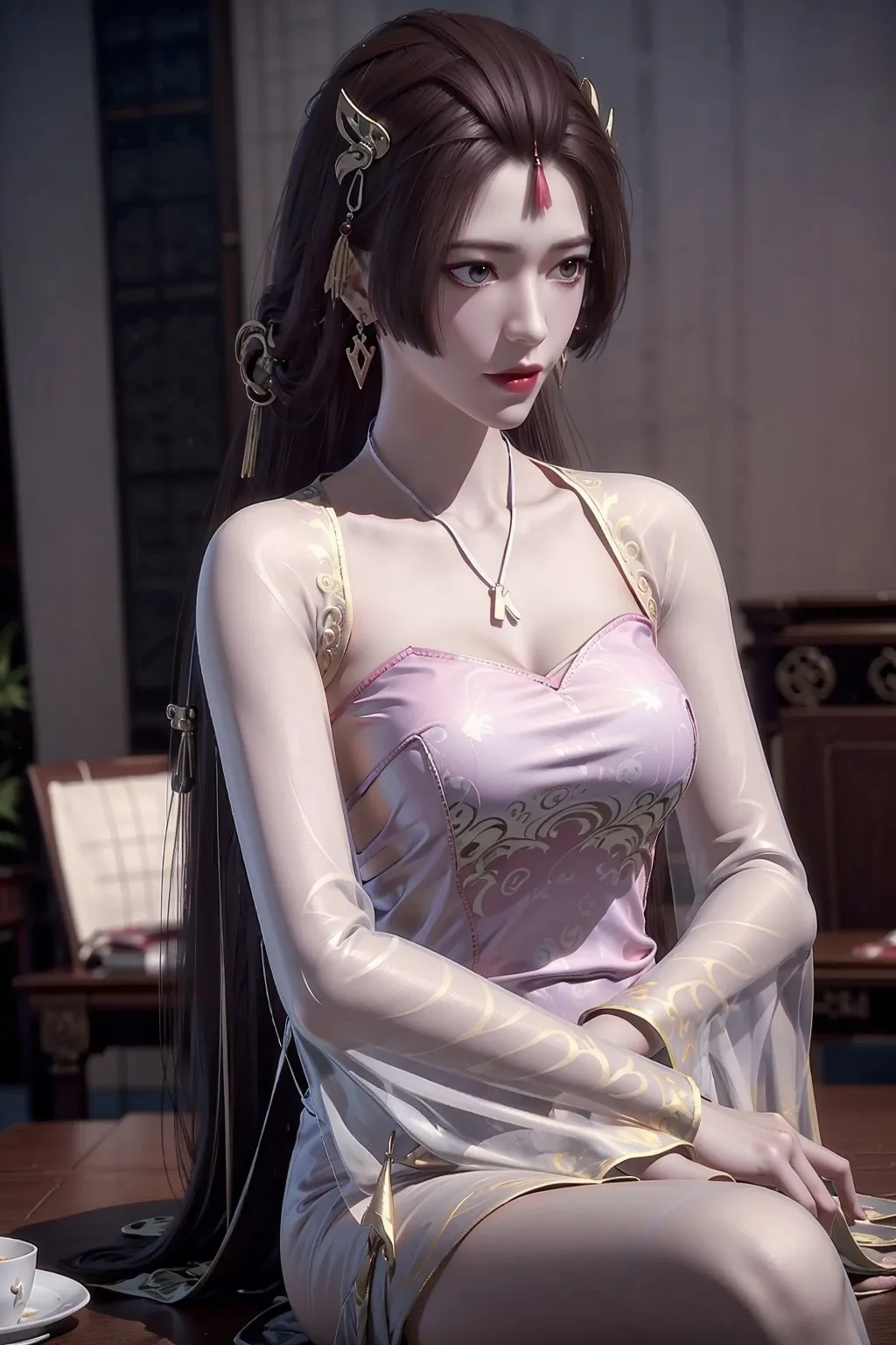 胡美人此時身著一身粉色的短裙宮袍,香肩裸露在外,宮袍的後背大開,露出了嬌嫩細膩的後背以及兩條粉色肚兜的繩線。