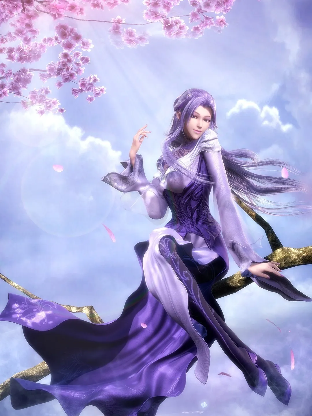 女人紫色的長髮以銀簪盤成雲鬢,這盡顯優雅與靈動。